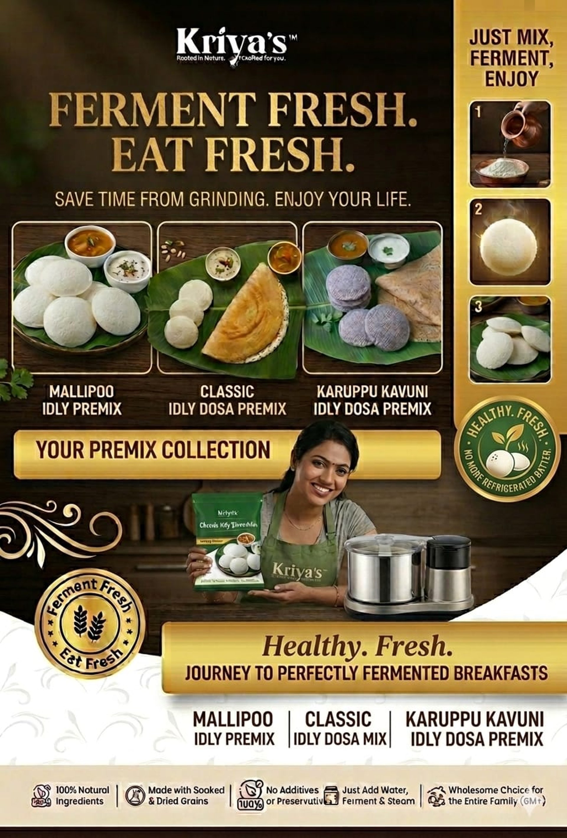That belief led us to create Kriya’s — a line of ready-to-ferment, naturally preserved mixes for idly, dosa, and medu vada — all made with clean ingredients and zero compromise.